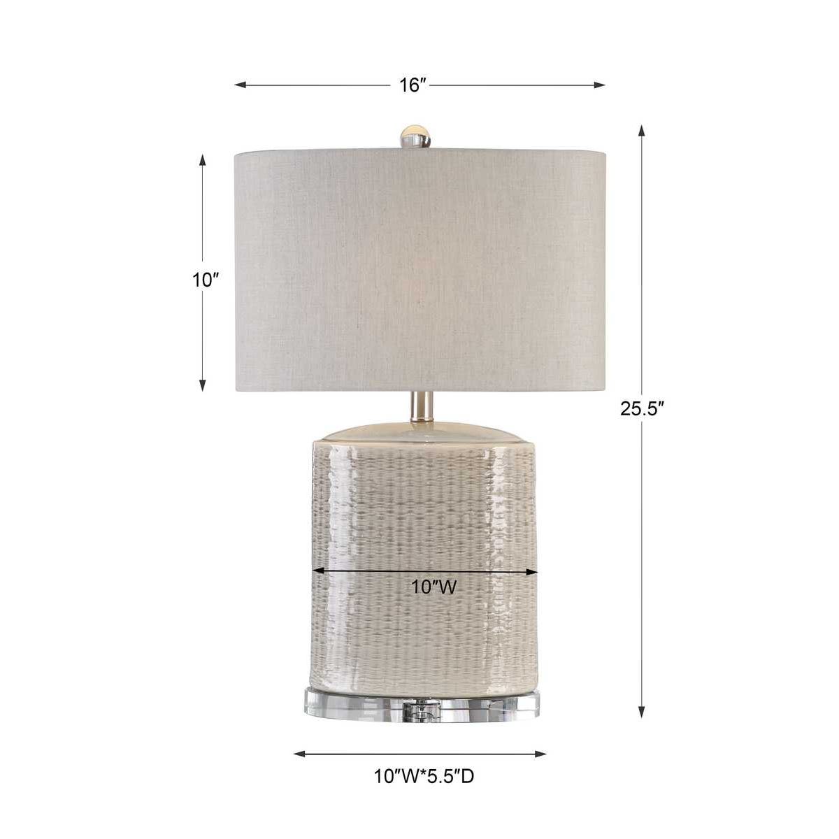 Textured, oval ceramic base finished in a light taupe-gray glaze, with brushed nickel plated accents and crystal details. The oval hardback drum shade is a beige linen fabric with natural slubbing. Due to the nature of fired glazes on ceramic lamps, finishes will vary slightly.