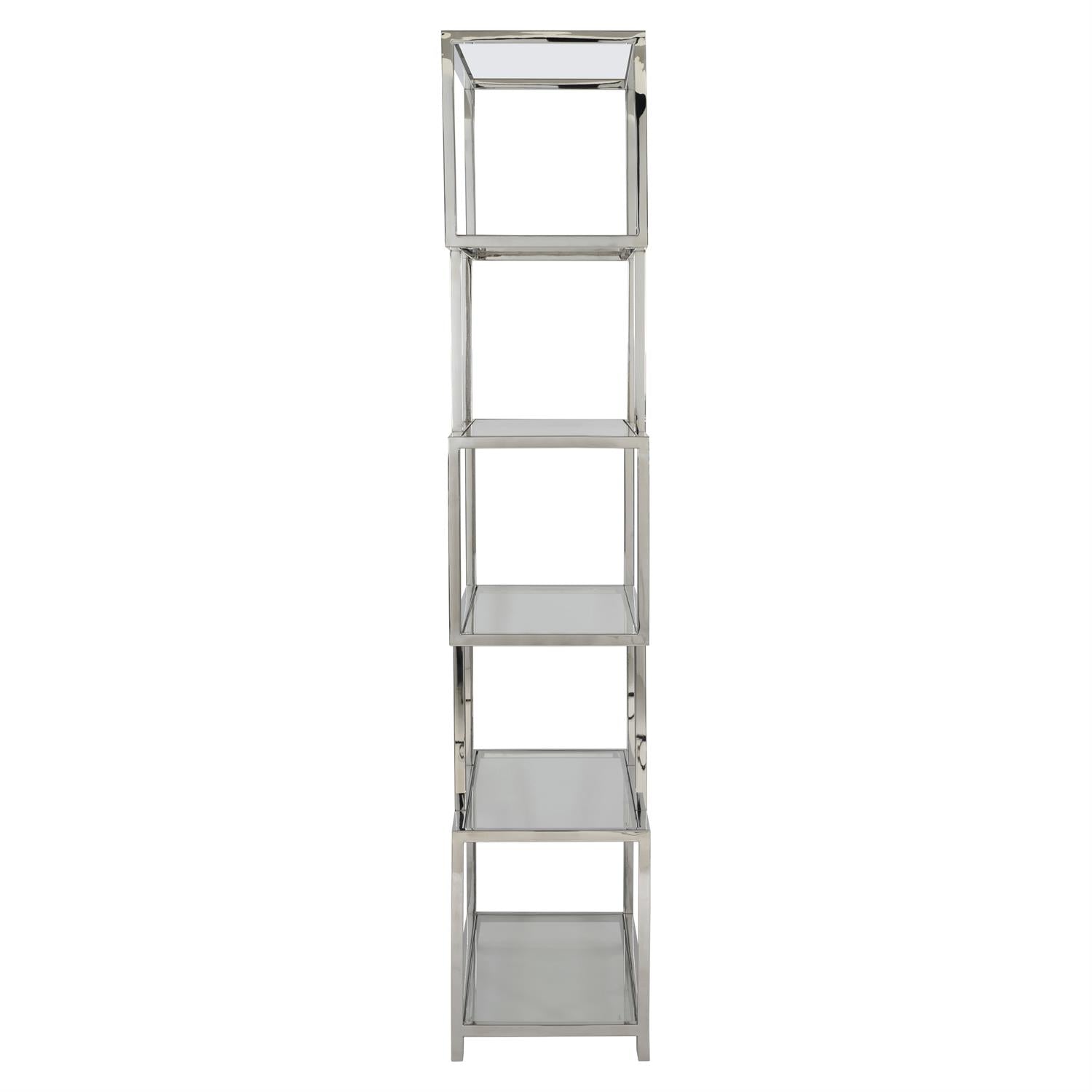 Polished stainless steel solid and tubular frame with five inset tempered glass shelves with polished edges