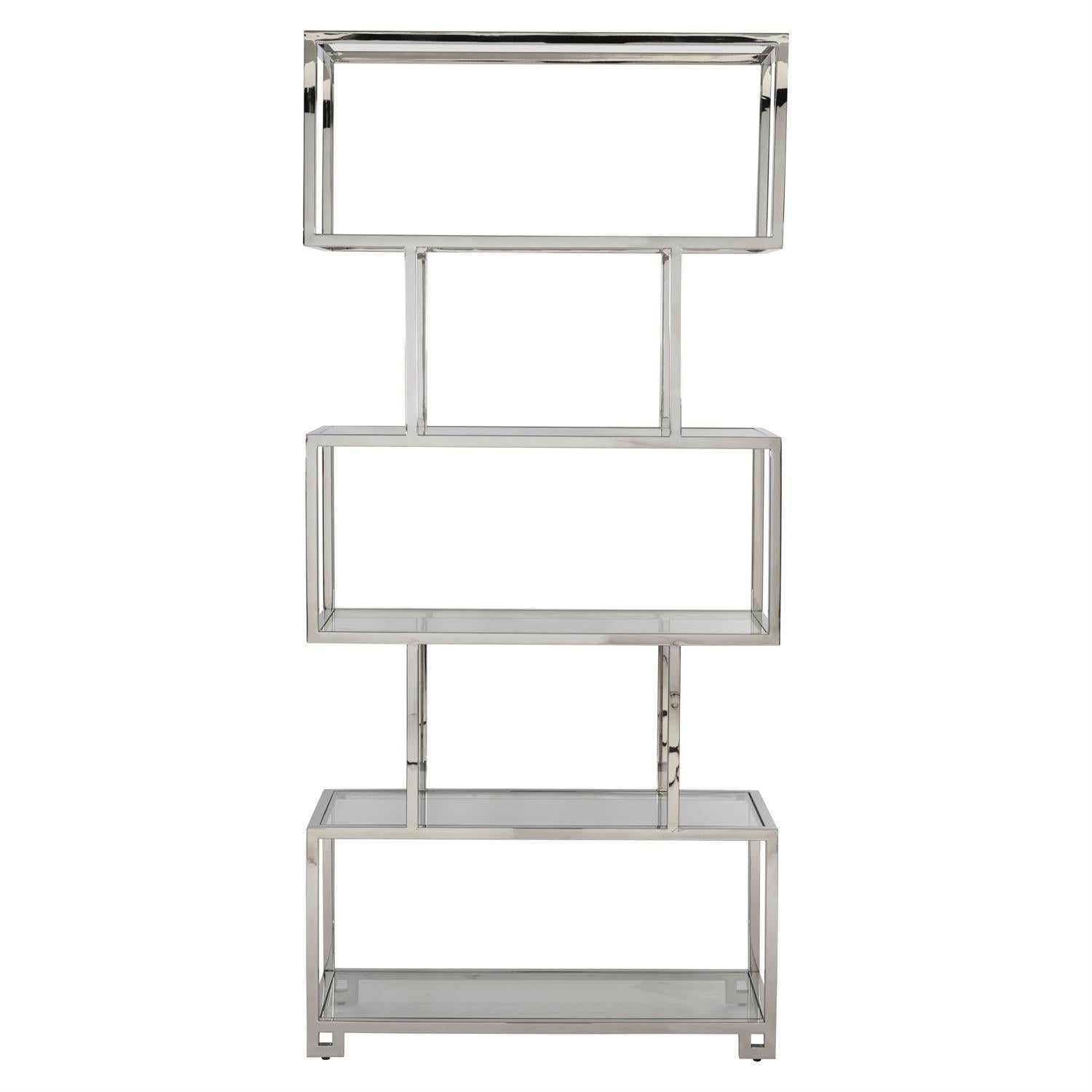 This etagere features an open construction and stacked box look in polished stainless steel with tempered glass shelves.