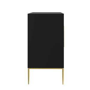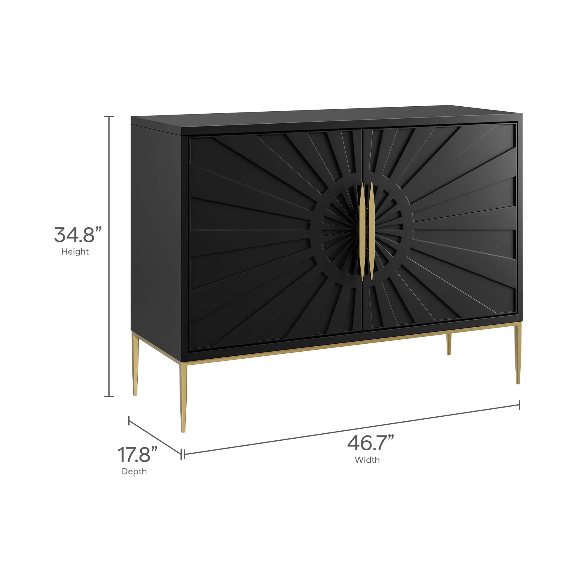 The Awaken 47" Accent Cabinet brings intricate modernity to your space. Featuring clean lines in a radial formation, this wide storage cabinet is crafted from wood veneer and rests on a sleek gold base with non-marking foot pads to protect your floors. The doors showcase a striking sunburst design, with radiating lines that form a dynamic and visually captivating pattern. Accentuated by gold hardware, this piece offers four large cubbies with two adjustable shelves perfect for storing linens, home décor, silverware, barware, and more. Ideal for the hallway, entryway, or living room, this two-door cabinet combines functionality with style. Assembly required. Weight capacity: 200 lbs.