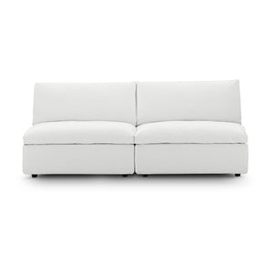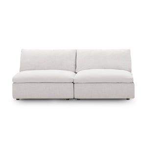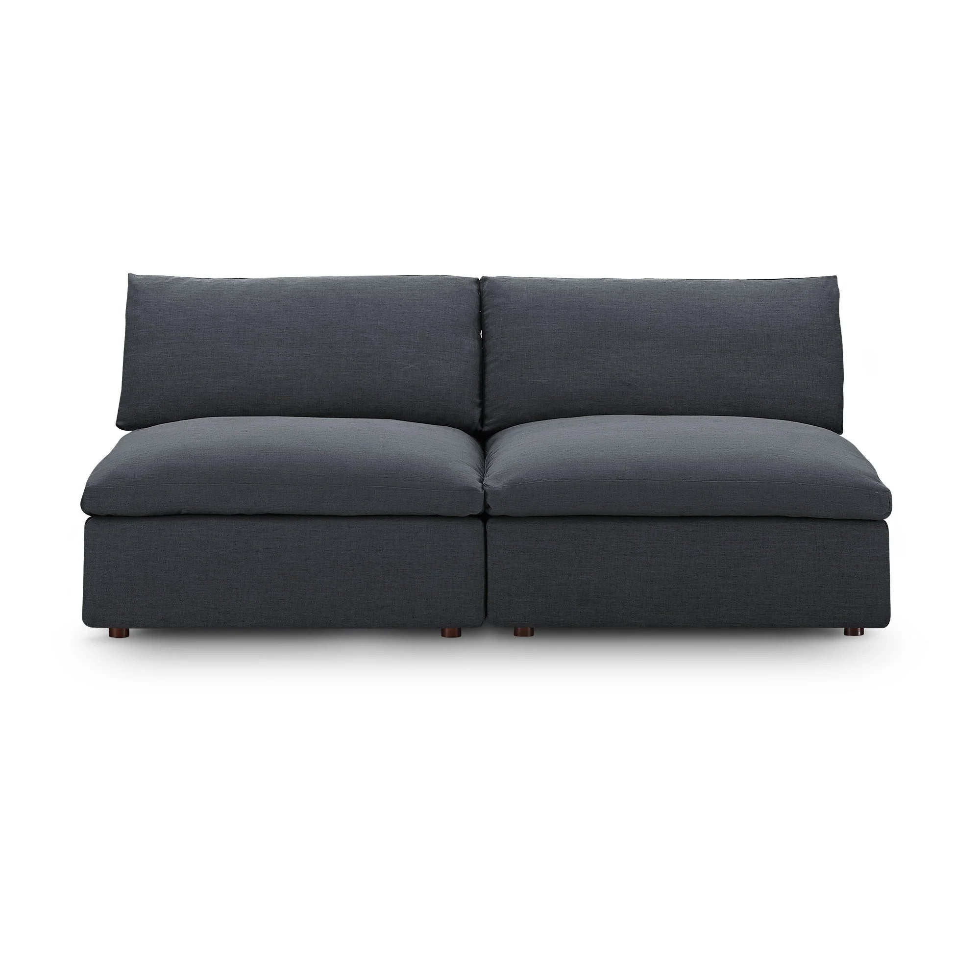 A haven for cozy relaxation, the Commix Armless Loveseat offers plush comfort and a clean-lined design. Made up of two armless chairs, its spacious profile makes an attractive statement in any modern home. Upholstered in polyester fabric for a linen-like texture, this contemporary modular sofa features generously padded down feather and cotton cushions, providing a luxurious sink-in feel. Built on a solid wood frame, the Commix deep sectional sofa is perfect for living rooms, family rooms, or game rooms. Made for sprawling out or curling up, this 2 seater couch beckons you and guests to sit and stay a while. Includes plastic foot glides and two armless chairs, each supporting up to 331 lbs.
