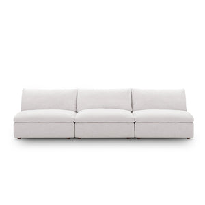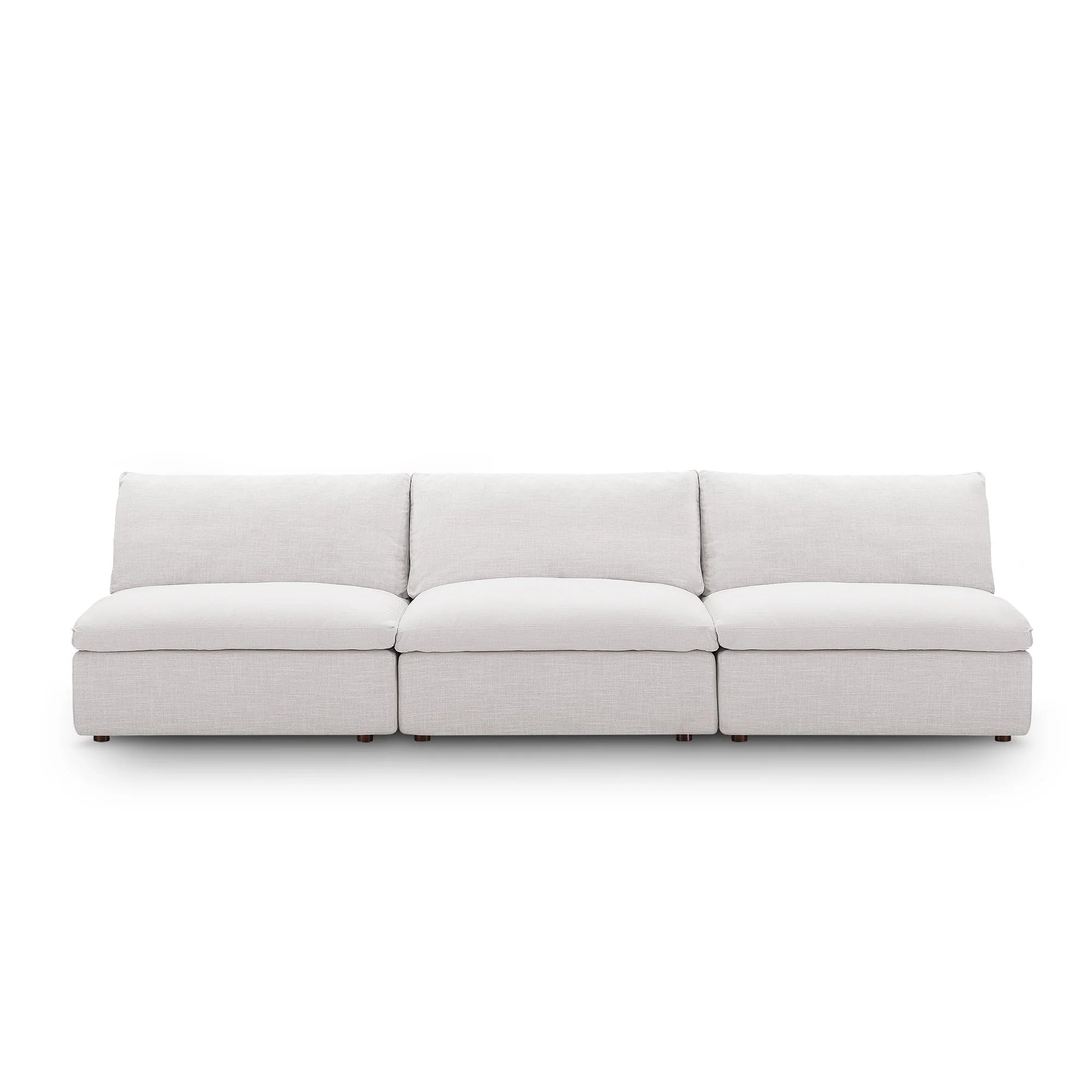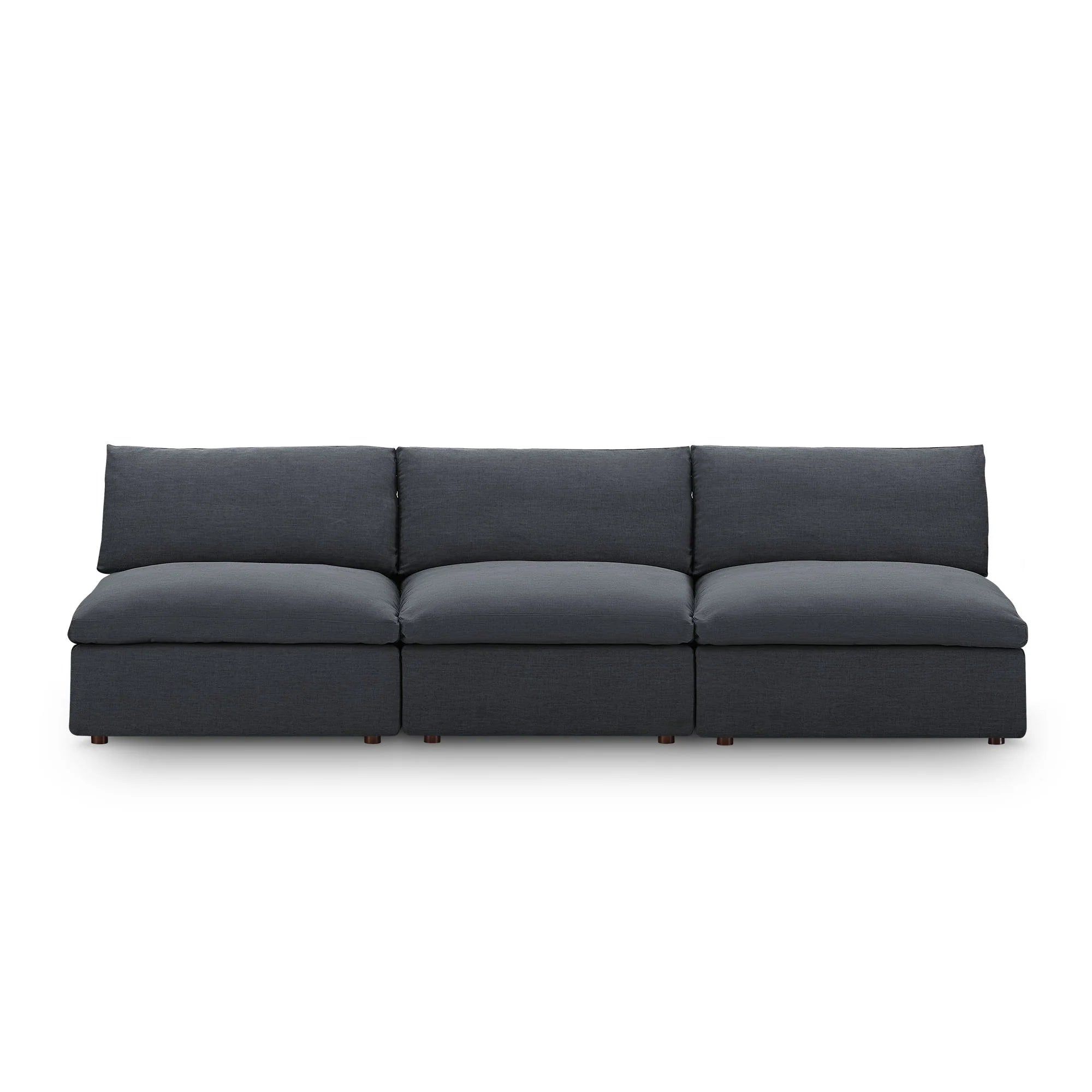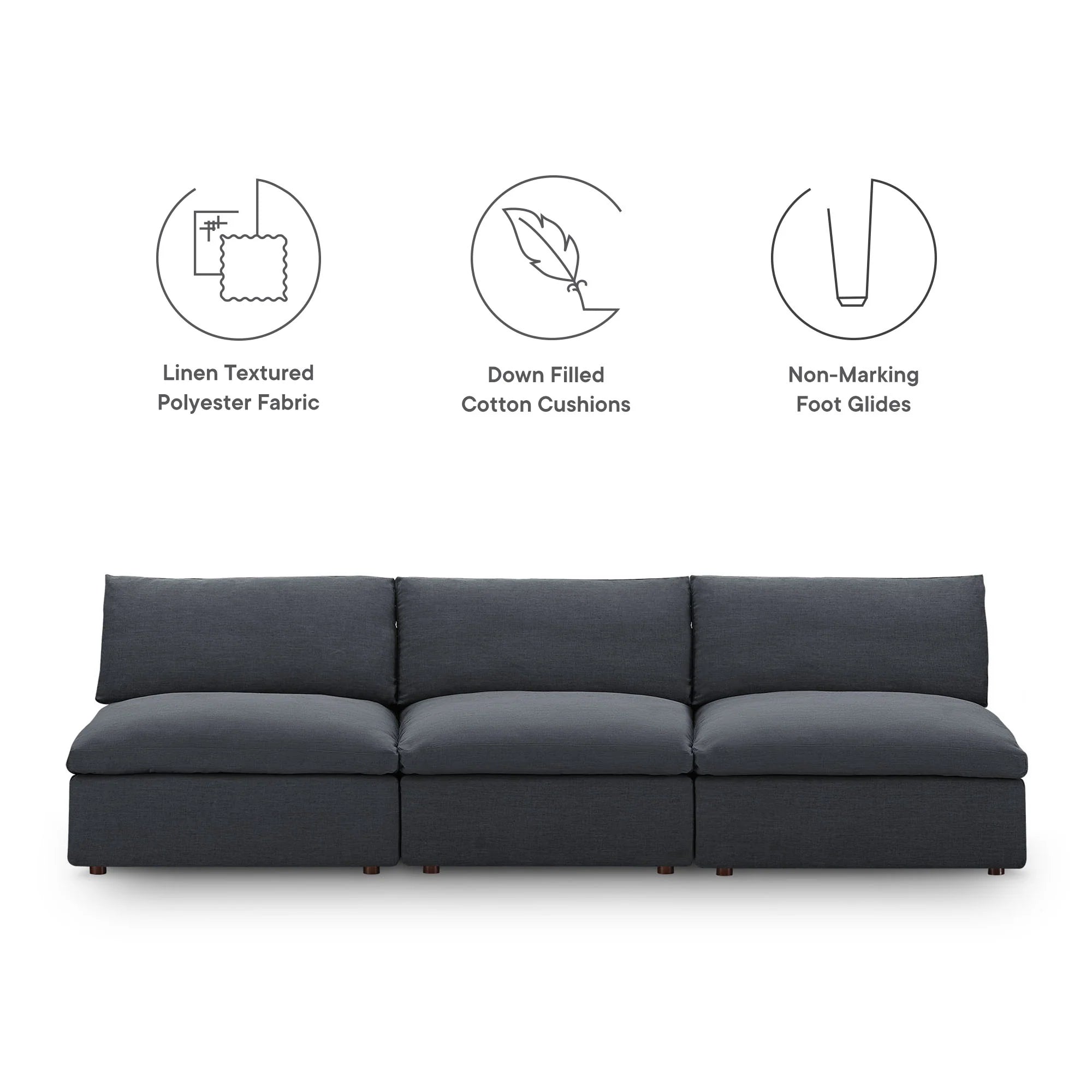 A haven for cozy relaxation, the Commix Armless Sofa offers plush comfort and a clean-lined design. Made up of three armless chairs, its spacious profile makes an attractive statement in any modern home. Upholstered in polyester fabric for a linen-like texture, this contemporary modular sofa features generously padded down feather and cotton cushions, providing a luxurious sink-in feel. Built on a solid wood frame, the Commix deep sectional sofa is perfect for living rooms, family rooms, or game rooms. Made for sprawling out or curling up, this 3 seater sofa beckons you and guests to sit and stay a while. Includes plastic foot glides and three armless chairs, each supporting up to 331 lbs.