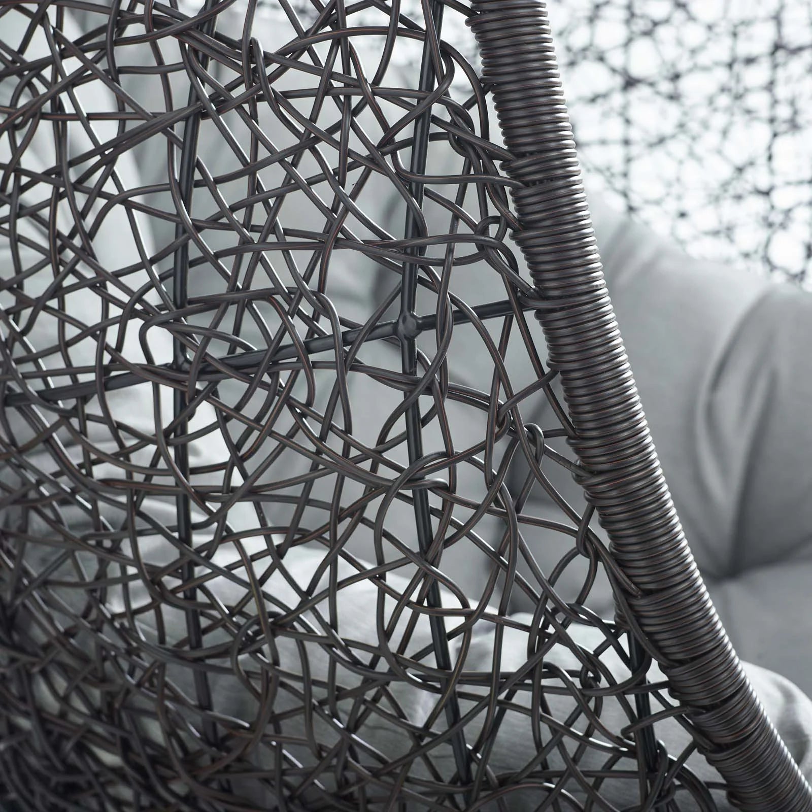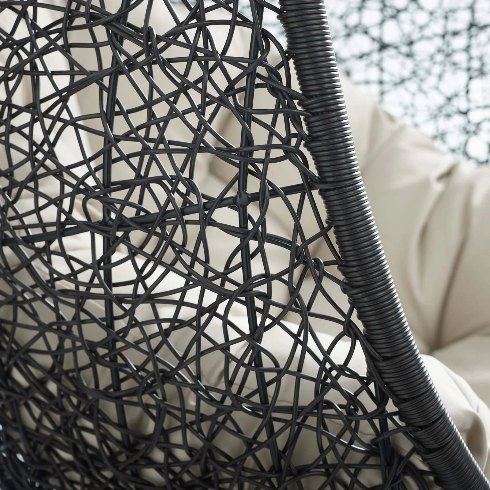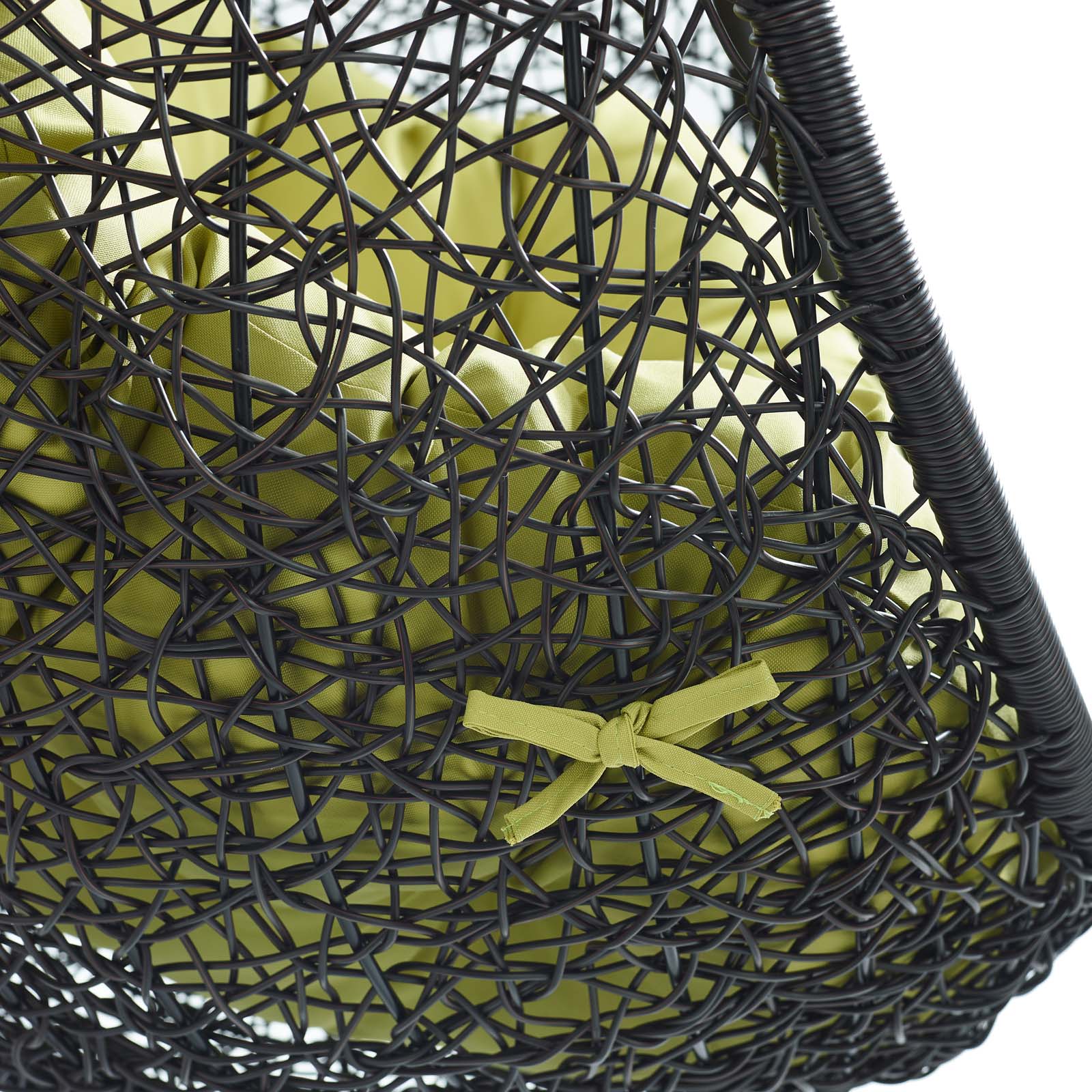 Embark on moments of metamorphosis and rebirth with an exotic hanging outdoor swing chair. Transform the mundane to heightened states of consciousness with Encase Outdoor Swing Chair. This hanging swing chair is comprised of a sturdy espresso metal stand and rattan seat. Surround yourself with plush fabric cushions to complete entry into a relaxed state in the Encase Hanging Chair.
