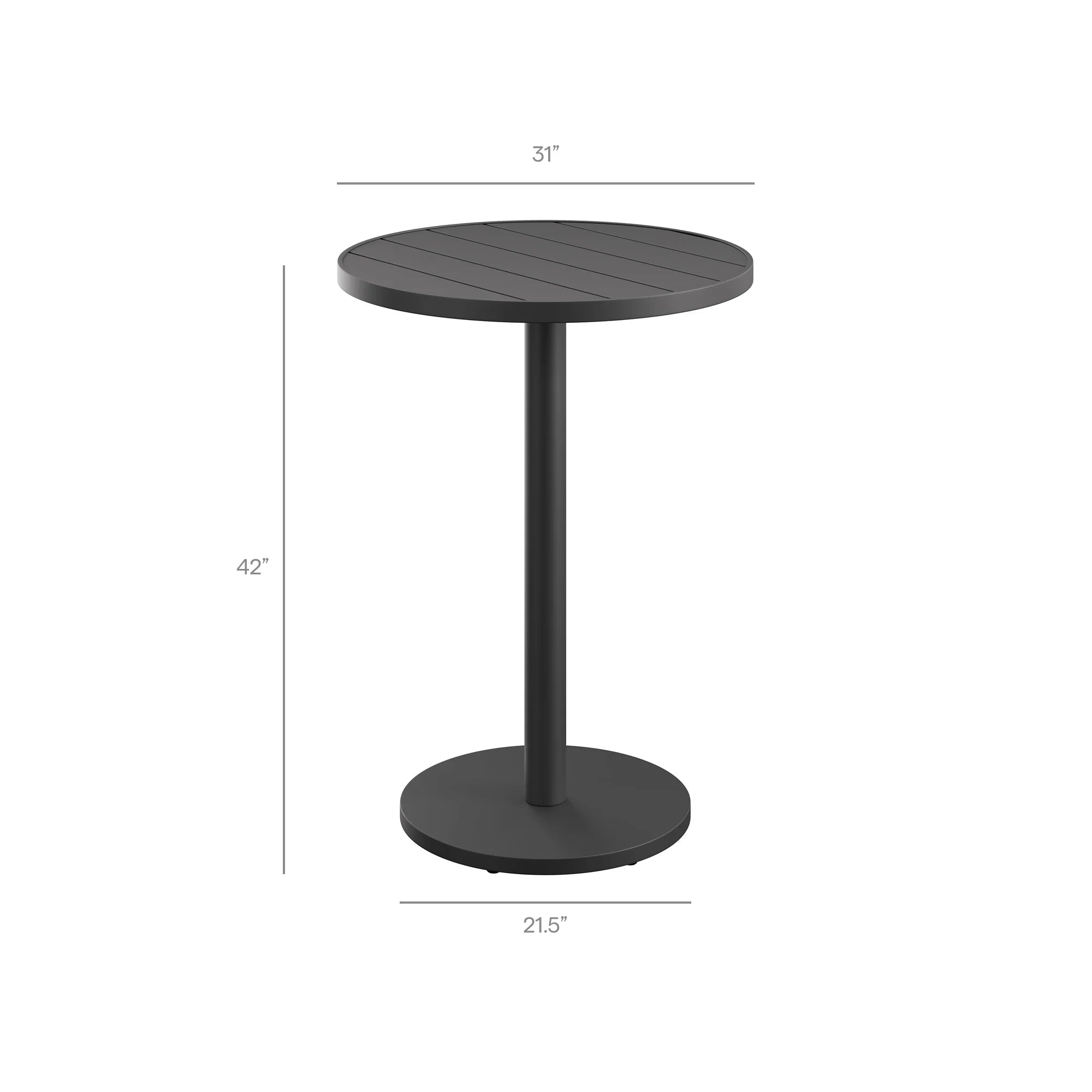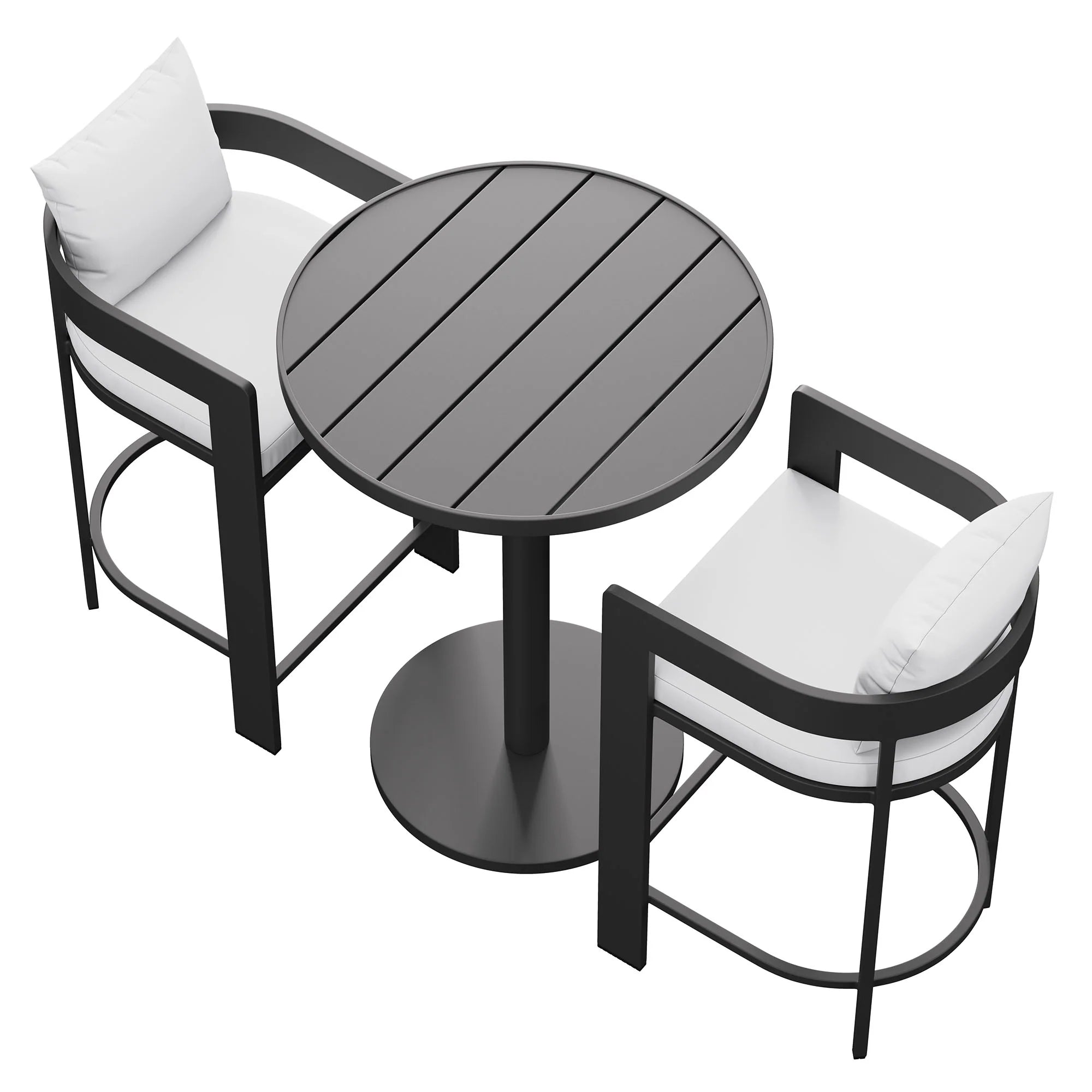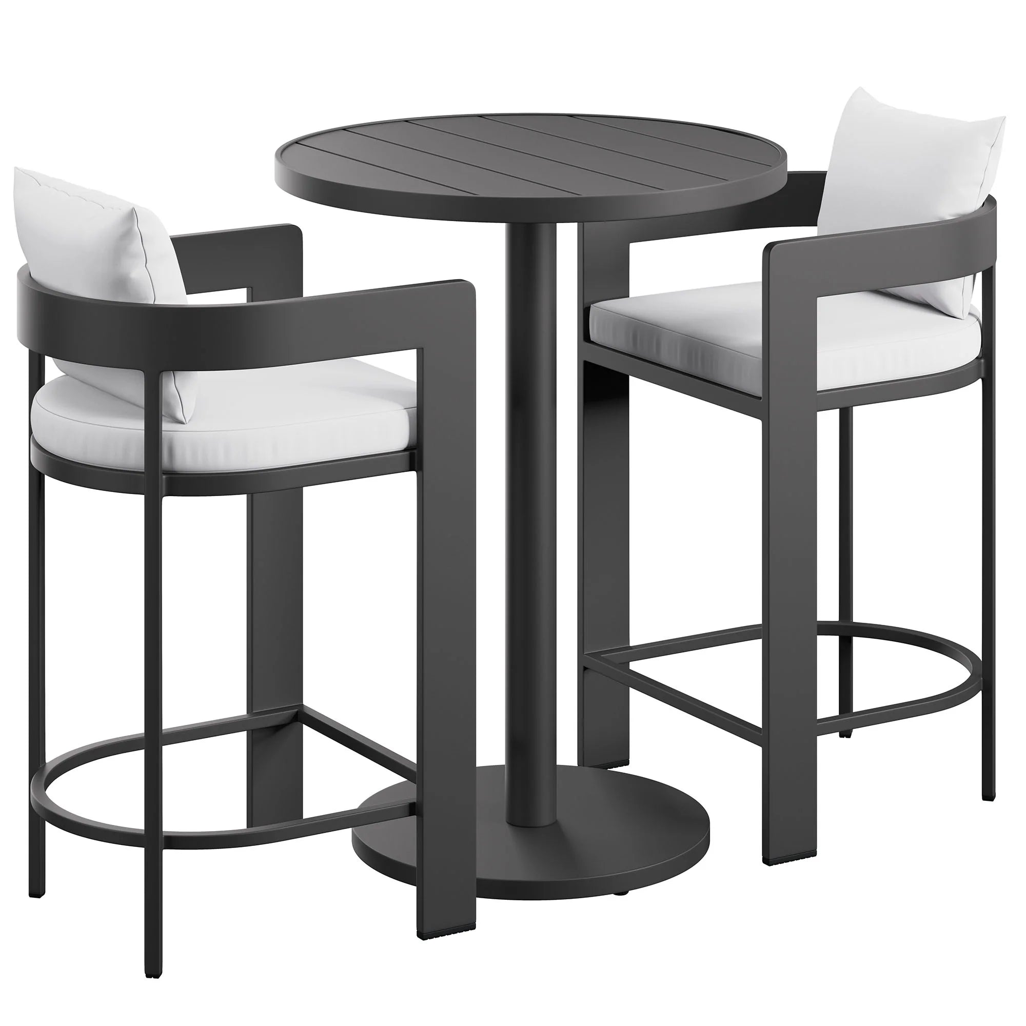 Enliven your alfresco spaces with the Tahoe Outdoor Patio 3-piece Bar Set. Built with durable aluminum frames and finished in a smooth powder-coated finish, this bar table and chairs set brings a clean, modern look to outdoor spaces. The set includes one round bar-height table and two matching bar chairs for drinks, casual meals, and easy conversation. Featuring a slatted tabletop with smooth edges and coordinating slatted chair seats, Tahoe wipes down easily and stays simple to maintain. With easy assembly and adjustable plastic foot pins to help keep it level on uneven surfaces, this patio bar set for 2 is made for everyday outdoor dining. Table Weight Capacity: 177 lbs. Chair Weight Capacity: 300 lbs. Each.