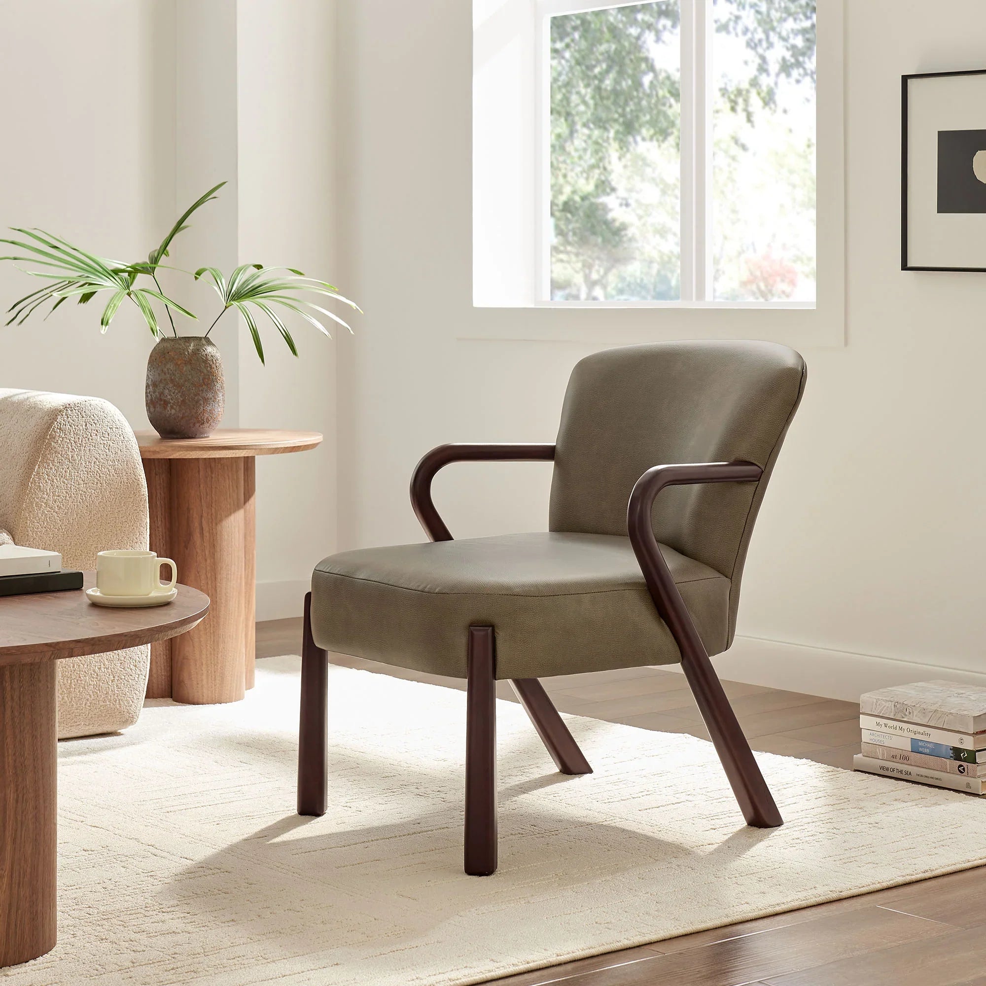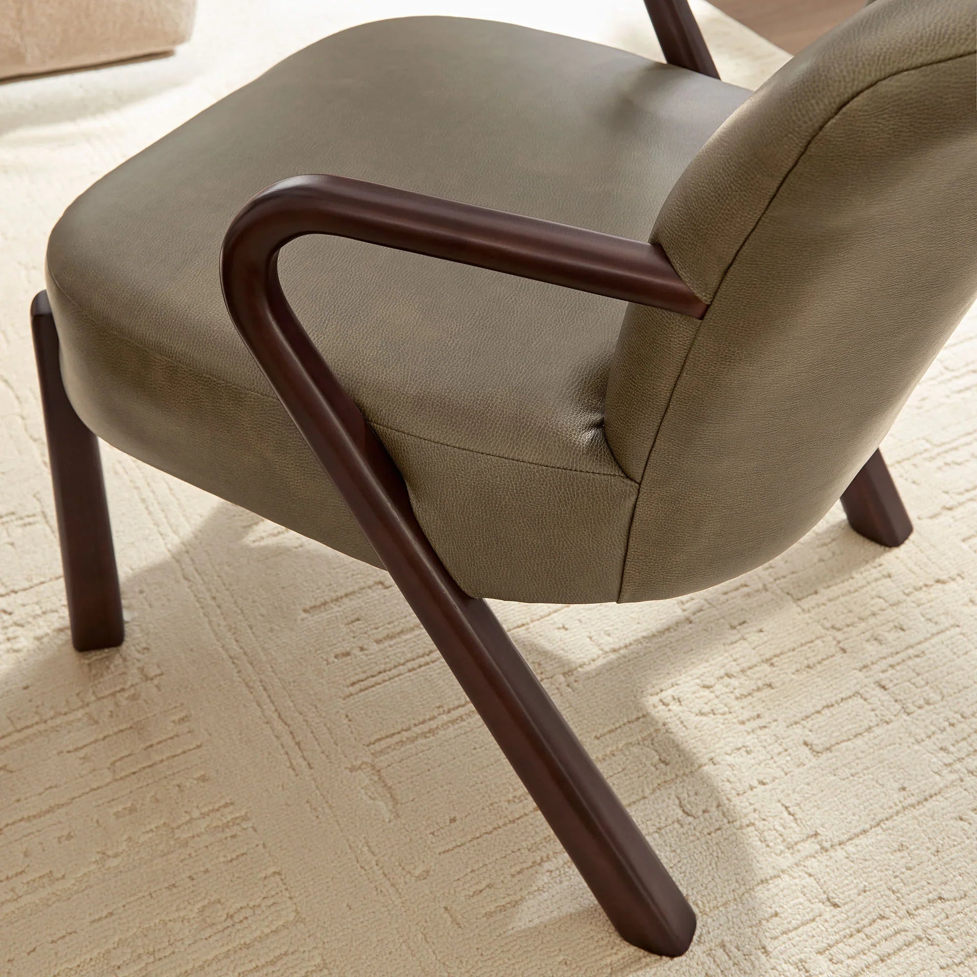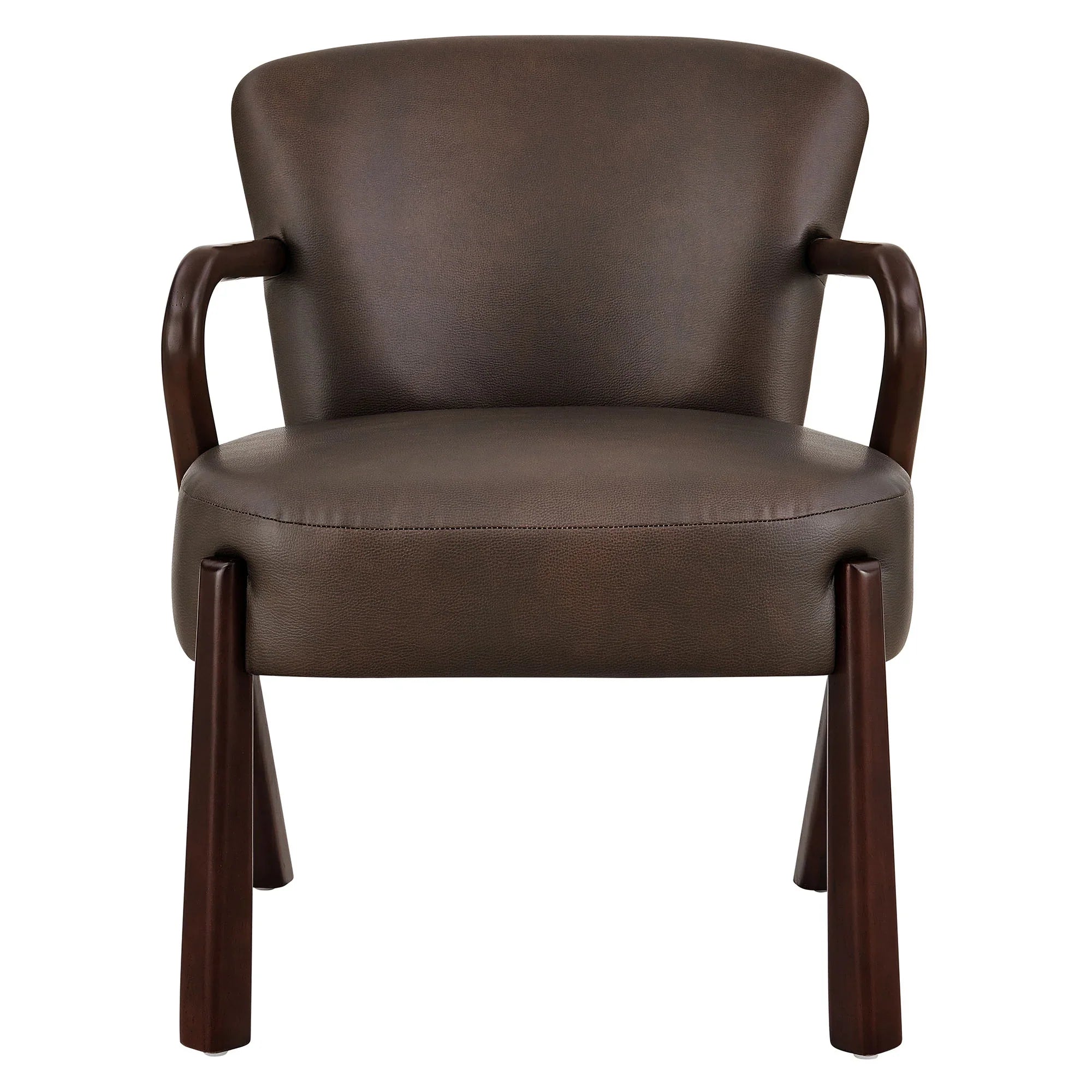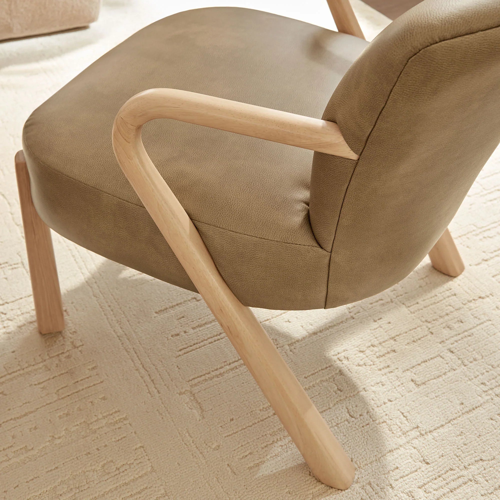 The Arden Accent Armchair combines cozy texture with a striking mid-century modern silhouette. Upholstered in vegan leather, this lounge chair offers a warm, inviting seat framed by gently rounded contours. The sculptural wood arms flow seamlessly into the chair’s angled legs, creating a unique, natural profile that feels both retro and modern. Foam padding ensures supportive comfort, while floor pins protect surfaces from scratches. Perfect for a bedroom corner, living room lounge, or reading nook, Arden adds tactile richness and iconic style to any setting. No assembly required. Weight Capacity: 300 lbs.